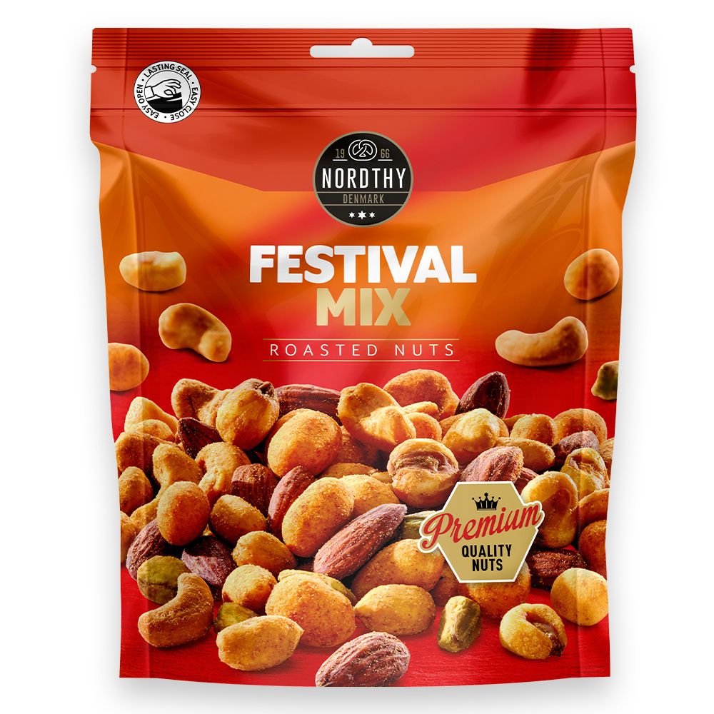 Ingredienser: 26% JORDNØDDER, 20% MANDLER, 20% CASHEWNØDDER, 11% majskerner, 5% PISTACIENØDDER, majsstivelse, solsikkeolie, rismel, kartoffelstivelse, sukker, krydderiekstrakter (løvstikke, ingefær), hydrolyseret SOJAPROTEIN, tomatpulver, JORDNØDDEOLIE, paprika, hvidløgspulver, løgpulver, koriander, løvstikke, chili, aromaer, smagsforstærker (E621), gærekstrakt, krydderurter (basilikum, oregano, persille, timian), peber, OSTEPULVER, farvestof (E160c), brændt sukker, hydrolyseret vegetabilsk protein, konserveringsmiddel (E262), syre (E330). Kan indeholde spor af alle andre nødder og sesamfrø.