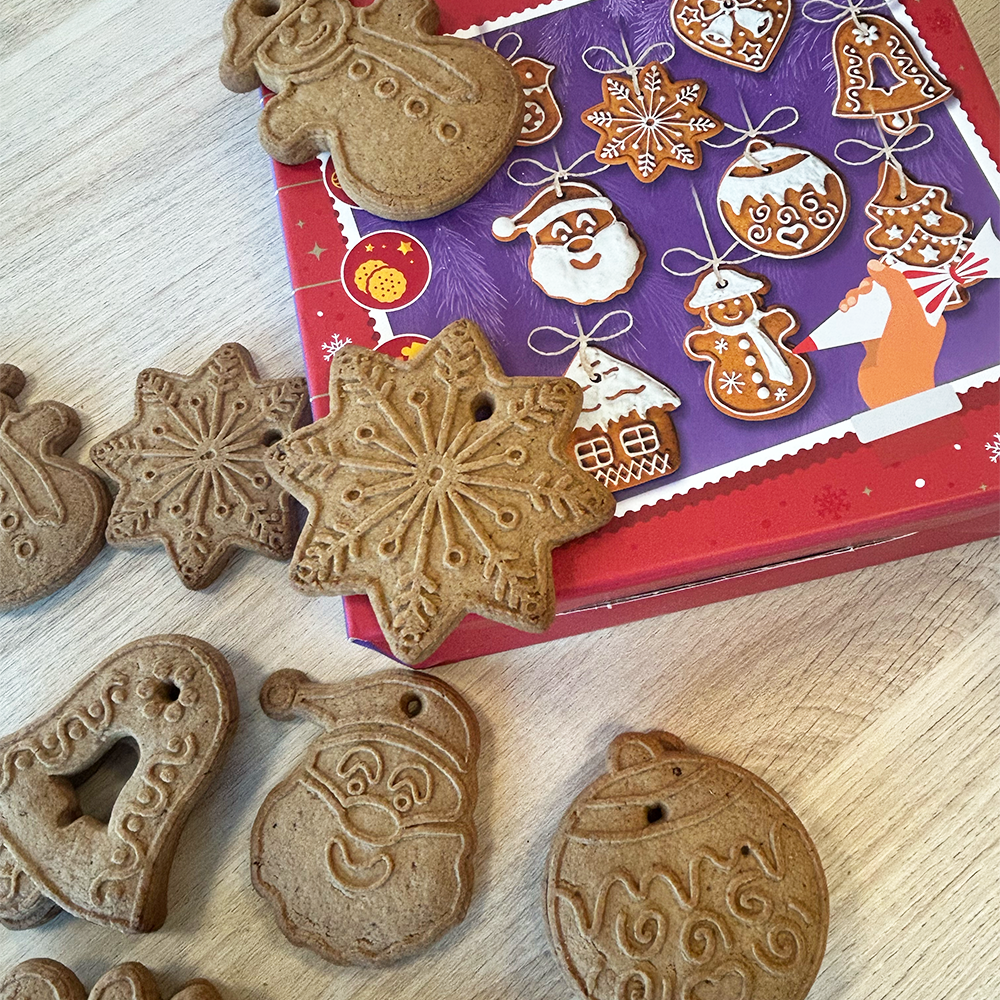 Pakken indeholder 9 forskellige julemotiver og 18 brunkager i alt. Der medfølger dekorationsposer, flormelis og snor til at hænge figurerne op.