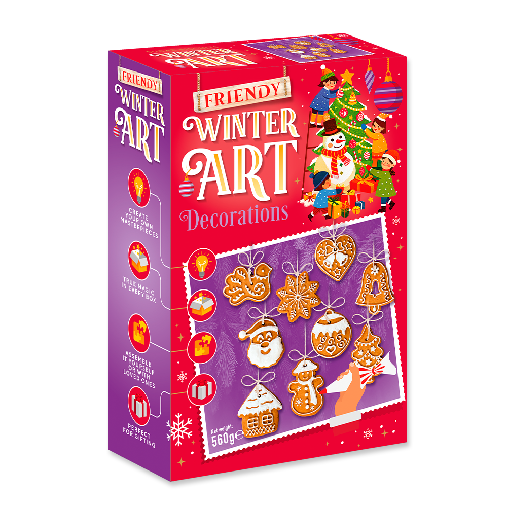 Gør julen ekstra hyggelig med Friendly Winter Art Decorations! Denne festlige kagedekorationsæske indeholder alt, du skal bruge for at skabe dine egne små mesterværker i vintertema. Pynt søde figurer som snemænd, juletræer, stjerner og hjerter – perfekt til pynt på julebordet, i vinduet eller som spiselige gaver. Sjovt for både børn og voksne, når kreativiteten slippes løs i køkkenet.