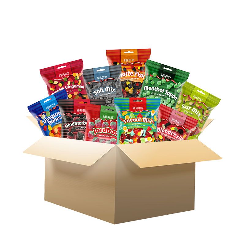 Slikkassen er en kasse med næsten alle vores slikpose-varianter – her er da sikret noget til enhver sød tand!